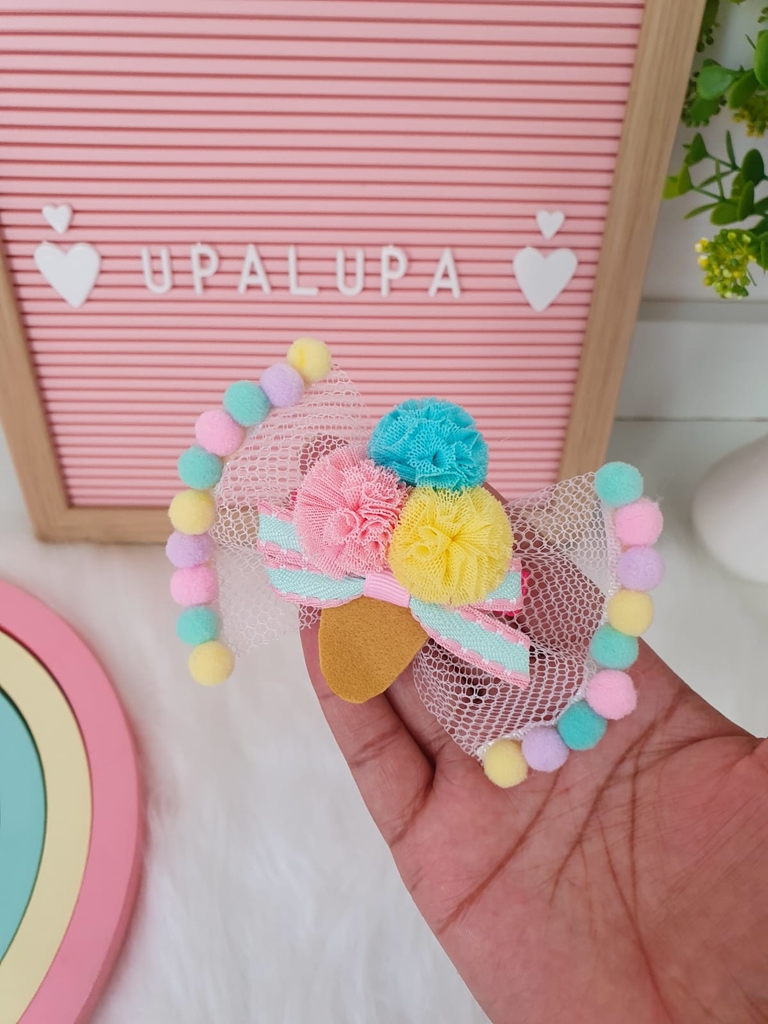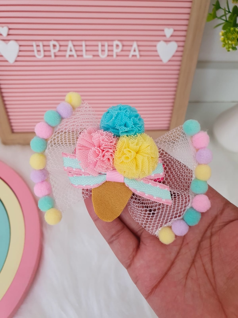 Pompons coloridos e um aplique de sorvete que vão fazer sua menina brilhar! Ideal para qualquer ocasião, seja para a escola ou uma festa.