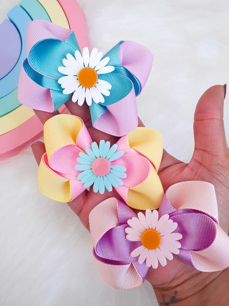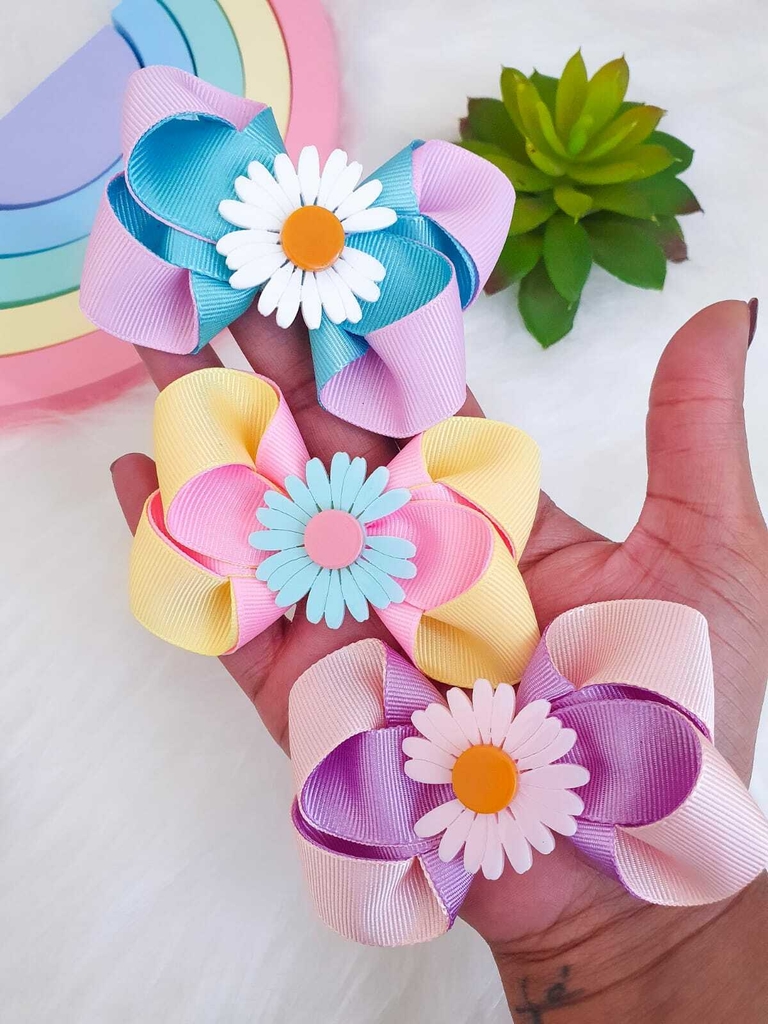 Alegre e delicado, o laço colorido margarida é perfeito para dar um toque de cor e encanto ao look da sua pequena. Combinando tons leves e uma flor central charmosa, é ideal para destacar qualquer produção com leveza e diversão.