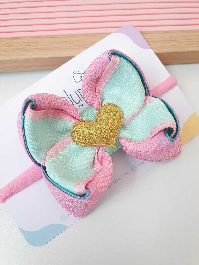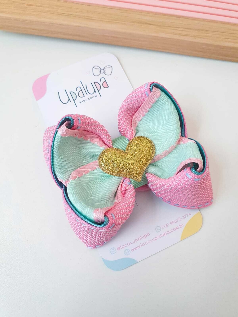 Laço especial de coração, verde bebê com rosa, modelo estruturado, as mamães amam este modelo.
