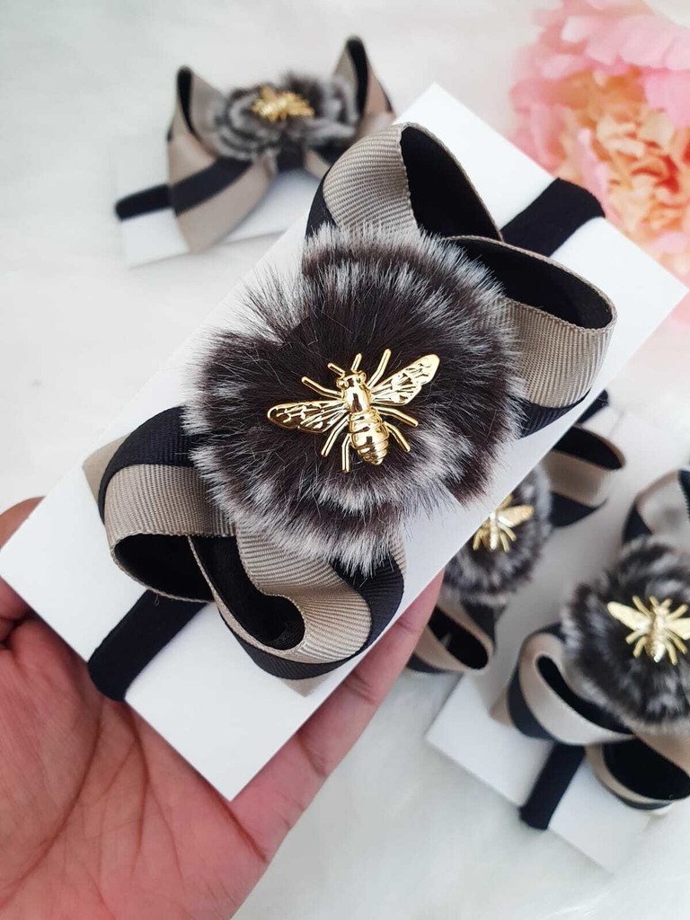 Elegante e cheio de personalidade, o laço de inverno em tom escuro traz um toque sofisticado ao visual da sua pequena. Inspirado em marcas famosas, ele conta com uma charmosa abelha no centro, que adiciona um detalhe único e moderno. Ideal para compor looks estilosos nos dias mais frios.